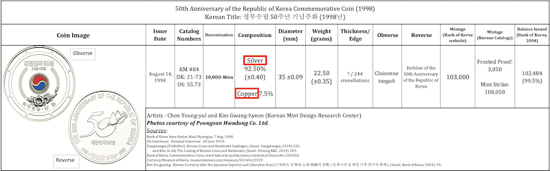 | 1998 | 50th Anniversary of the Republic of Korea | 10,000-Won | 84 | Cloisonne taeguk | 0.6691 | ----- |