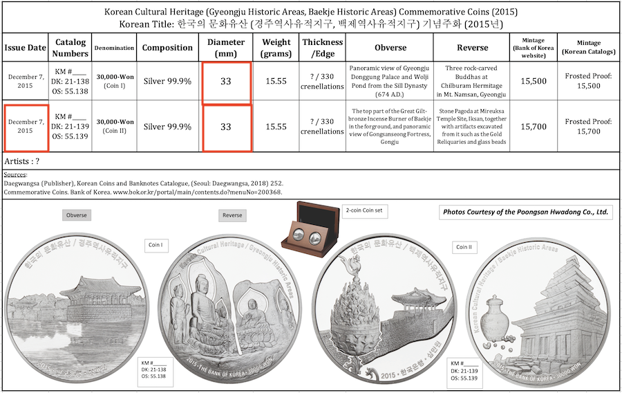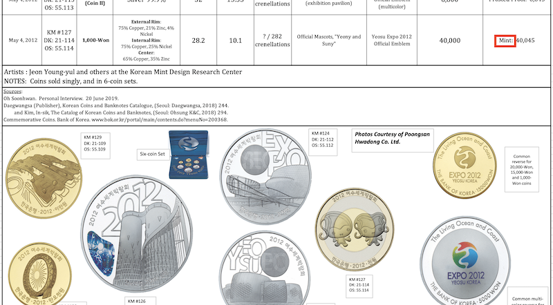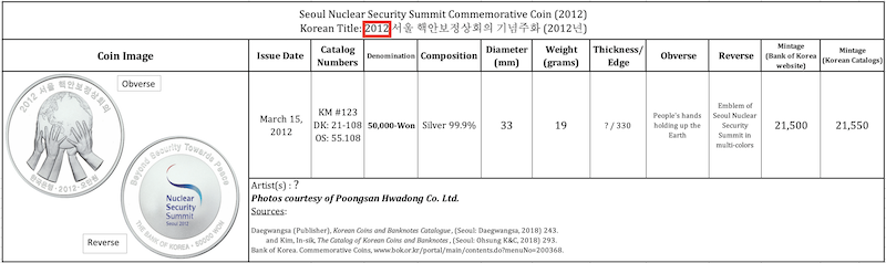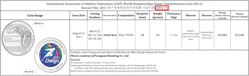 980 This information is based on the author’s personal observations after numerous encounters with the 1988-dated “archery” coins in the Korean market on six different visits to Seoul from 2003 to 2019. The South Korean numismatic retailer Sujipbank was selling an excellent-condition mint-strike version, ungraded and complete with original packaging, for only 39,500 KRW or about $34.00 USD in 2019; a far cry from the $200.00 USD price listed in catalogs outside of Korea.