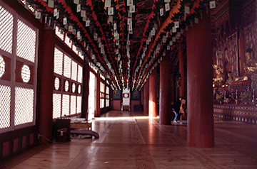 | This is Pirojon hall of Chikjisa temple in North Kyongsan Province. On the altar are hundreds of look-alike Buddha disciple statues. This temple is quite old- 1,580 years old, last being rebuilt in 1610 after being burnt down by Hideyoshi's troops during the Imjin War (1592-1598). |