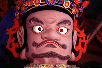 | The face of a temple guardian statue. Made of wood or clay, one can find these statues at most entrances to Buddhist temples in Korea. |