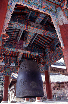 The iron temple bell of Hwaomsa temple in the Chiri mountains of South Cholla Province. Most temples in Korea have these iron bells hanging in similar structures as this. |