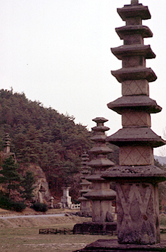 This is Unju-sa, a unique temple in South Cholla Province. Unju-sa has many unusual pagodas and Buddha figures. At one time, the temple was said to have thousands of these stone sculptures. According to 'Pungsu' (otherwise known as 'geomancy', or 'Feng Shui'), the Korean peninsula is unbalanced by the powerful 'Ki' (energy) of the mountains along the East Coast. These stone sculptures made in the southwestern part of the peninsula were an attempt to counterbalance the 'Ki' in the east. |