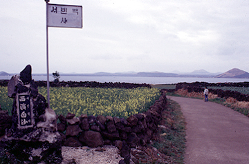 This is Udo, an smaller island just to the northeast of Cheju Island. Udo has an extensive round-pebble coral beach, and lots of black volcanic rock used to make walls to separate fields. |