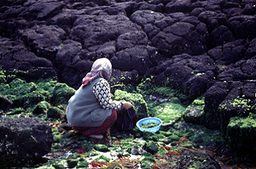 | ..an old woman collecting seaweed on the rocks near Hyopjae Beach on Cheju Island. Cheju Island is the largest island in Korea, and is an island province unto itself. The people of Cheju Island are hearty folk, and are kind to visitors. However, these people, like the people of South Cholla Province, have suffered greatly in recent history for their past strong feelings for separation from the administrative control of the mainland. The people of Cheju fought a guerrilla war against mainland control starting in 1948, for which they paid dearly. Between 15,000 and 30,000 islanders were killed in the fighting and by terrorism committed by right-wing mainlanders. The violence ended by 1950, leaving one in every five or six islanders dead and more than half of the villages destroyed. |