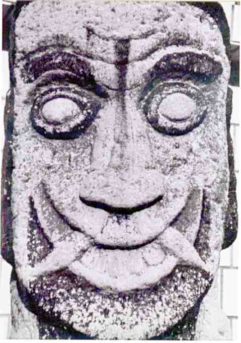 | This is a stone guardian totem known as a 'poksu', or 'sokjangsung'. It was made in 1906 to ward off evil spirits and disease from the village it protects near Chungmu, in South Kyongsan. In Korea, totems like this are generally made of wood, but in the area of Chungmu and Miruk Island they are made of stone. |