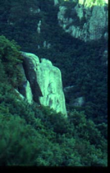 | Here you can see the massive rock-carved image of the Maitreya Buddha on the north slope of Kujong-bong in Wolchulsan. Carved by Paekche artists during the Silla era, it is designated National Treasure #144. |