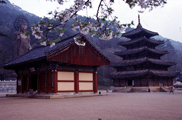 | This is Popchusa, a temple in Songnisan National Park in North Chungchong Province. It's a great place to visit, and the mountains are an easy climb. The five-story wooden pagoda (Palsangjon) seen here, is one of the oldest wooden buildings in Korea, and the only large wooden pagoda in Korea. It dates from the early 1600's. The Buddha statue is a Maitreya Buddha, the largest standing bronze Buddha in Asia. |