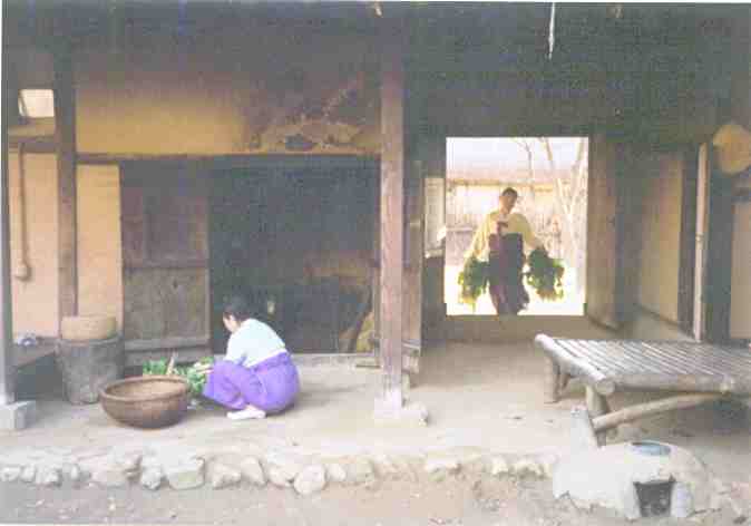 | The courtyard of a traditional Korean House. Such houses don't really exist in Korea any more. This one is in the 'Folk Village', an uninhabited tourist facility in Kyonggi Province. Many such traditional homes in South Korea were knocked down to be replaced by more modern housing, especially during the '60's, when the Park Chung Hee regime started the 'Saemaul-Undong' movement (New Village Movement). |