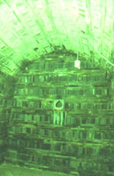 | This is the interior of the tomb of King Muryong of the Paekche Kingdom. Located just west of the town of Kongju in South Chungchong Province, this tomb was discovered in 1971 and had been completely undisturbed since 529, almost 1,500 years ago. It is one of the most significant archealogical finds in Korea, due to its importance to the understanding of Paekche culture. The inner chamber of this tomb is lined with decorative brick tiles, and here you can see one of the teardrop-shaped candle niches that are set into the walls. |