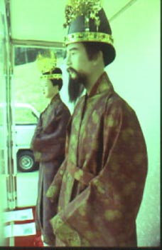..here is a reconstruction of what the Paekche royalty looked like. Note the gold crown (actually found in Muryong's tomb) and the style of dress that looks almost like a modern Japanese kimono. |