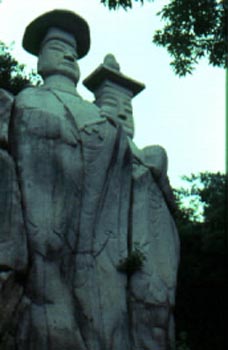 | This is the double Buddha statue, Paju Miruk, in Kyonggi Province. The bodies of this statue are carved in low relief into a flat rock face with separate stone blocks on top that make up the heads. Carved around 900 years ago, they are the only such twin figures in Korea. |