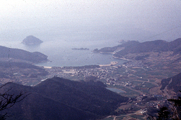 This is Sangju Beach, as seen from the top of Mt. Kumsan on Namhae Island In South Kyongsan Province. This is one of the finest white-sand beaches in Korea. |
