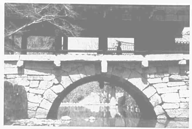 Near Sunchon in South Cholla, is Songgwangsa ("Spacious Pine Temple"). This temple complex was reorganized in 1969 as a monastic center for all sects of Mahayana Buddhism, and is one of the largest temple complexes in Korea. Shown here is the covered arch bridge leading to the temple's entrance. |