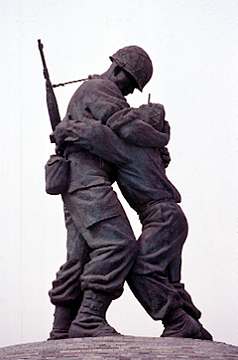 | A large statue of a South Korean soldier holding his North Korean brother. It stands atop a dome-shaped memorial for the Korean War at the War Memorial Museum in Seoul. |