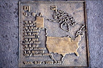 | ..a plaque placed in the floor of the of the dome-shaped memorial at the museum. The contributions of 16 countries that fought on the United Nations side during the Korean War are depicted on plaques like this. This one depicts the U.S. contribution to the war. As you can see from the major military units listed on this plaque, U.S. involvement was significant. By late September 1950, the U.S. expeditionary force in Korea totaled 309,843 personnel, about half the total U.S. armed forces including nearly all of its combat-ready units in the world. In a curious reversal of policy, Washington made a huge commitment to land war in Asia on a narrow penninsula that most other strategists had declared peripheral, if not indefensible. |