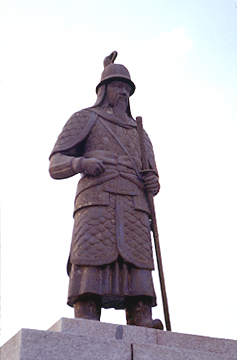 | ..a statue of Yi Soon-shin, the great Korean admiral who defeated the Japanese in both 1592 and 1598. He did so by creating unique ships and using them with tremendous tactical skill. After his first victory in 1592, he was the victim of jealousy and was reduced to the rank of private, and later thrown in jail. When Japanese forces started arriving again in 1597, the Koreans pulled him out of jail and gave him back his commission. He died during the final battle, and became a national hero. He is highly revered in both North and South Korea to this day. |