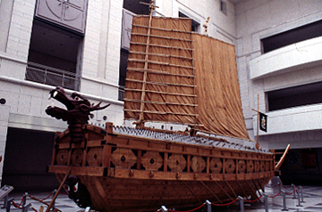 ..this is Admiral Yi's secret weapon, the 'turtle ship'. Well-armored and well-armed, these ships smashed the Japanese fleet and cut Hideyoshi's supply line to his troops in Korea, resulting in his defeat. |