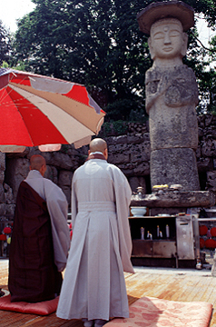 | Nuns pray in front of the 10-meter tall Miruk buddha at the Miruk-saji temple site in North Chungchong Province. This is a recently excavated temple site of the Koryo Dynasty era. |
