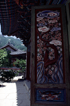 The ornate carved doors of Tonhaksa temple in Kyeryongsan National Park in South Chungchong. The doors are brightly painted with crane, cherry blossom, and bamboo designs. Tonghaksa temple is one of the very few places in Korea for the training of Buddhist nuns. |