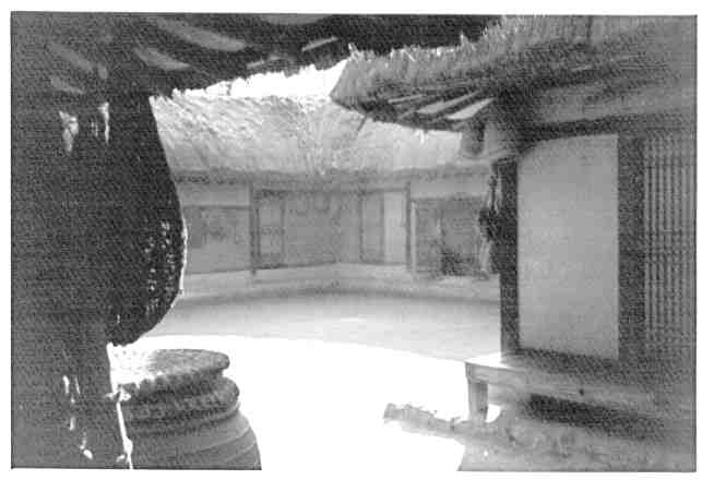 | The courtyard of a traditional Korean House. Such houses don't really exist in Korea any more. This one is in the 'Folk Village', an uninhabited tourist facility in Kyonggi Province. Many such traditional homes in South Korea were knocked down to be replaced by more modern housing, especially during the '60's, when the Park Chung Hee regime started the 'Saemaul-Undong' movement (New Village Movement). |