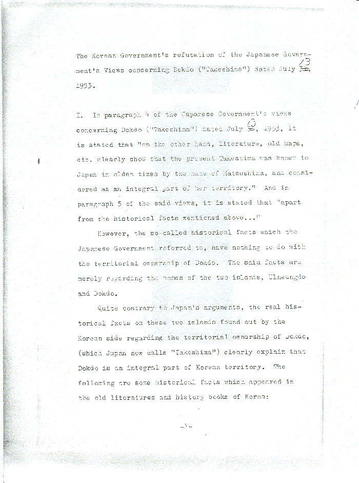 The Korean Government´s Refutation of the Japanese Government´s Views Concerning Dokdo ("Takeshima") Dated July 13, 1953
